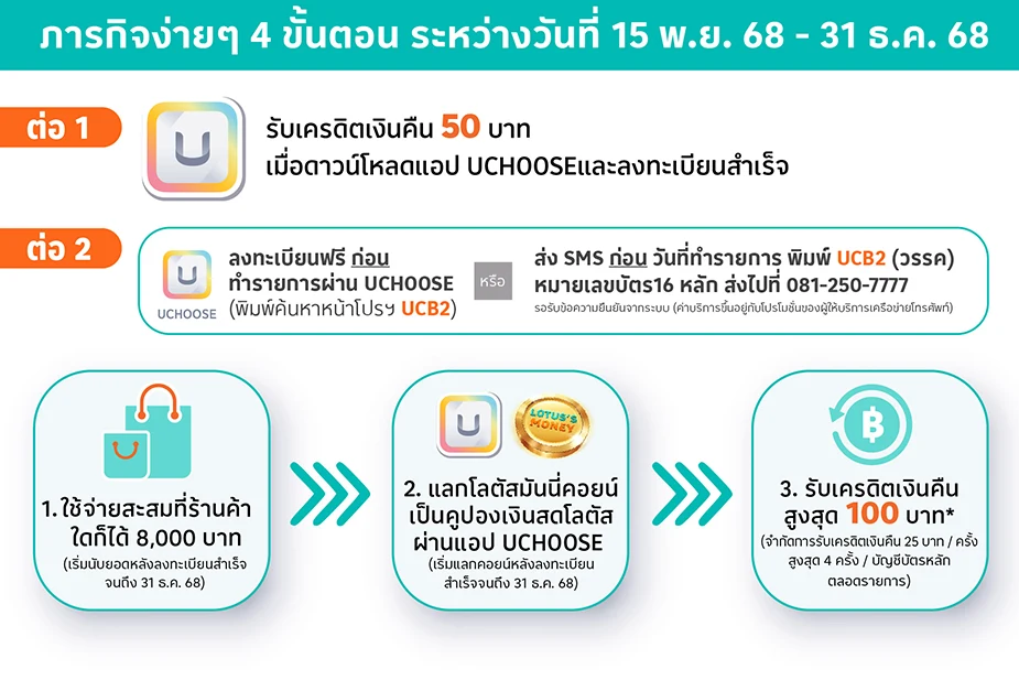 • ต่อ 2 สะสมยอดใช้จ่ายผ่านบัตรเครดิตโลตัส มาสเตอร์การ์ดเต็มจำนวนที่ร้านค้าใดก็ได้ครบ 8,000 บาท และแลกโลตัสมันนี่คอยน์ผ่านแอป UCHOOSE รับเครดิตเงินคืน 25 บาทต่อรายการแลกคอยน์ นับยอดใช้จ่ายสะสมและรายการแลกคอยน์ที่เกิดขึ้นหลังลงทะเบียนสำเร็จ ระหว่างวันที่ 15 พ.ย. 68 – 31 ธ.ค. 68 จำกัดรายการแลกคอยน์สูงสุด 4 ครั้ง หรือรับเครดิตเงินคืนสูงสุด 100 บาท ต่อบัญชีบัตรหลัก ตลอดรายการสำหรับต่อที่ 2