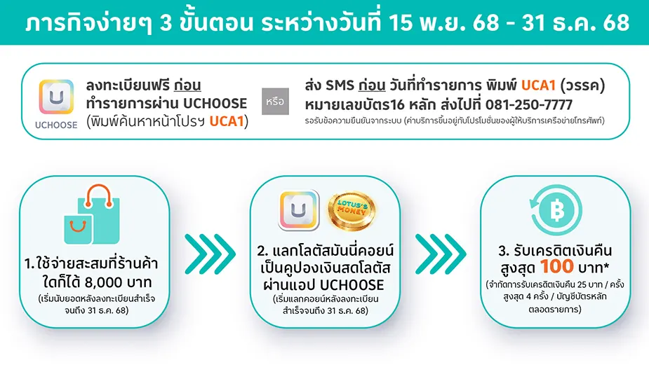 • มียอดใช้จ่ายผ่านบัตรเครดิตโลตัส มาสเตอร์การ์ดเต็มจำนวนที่ร้านค้าใดก็ได้สะสมครบ 8,000 บาท และแลกโลตัสมันนี่คอยน์ผ่านแอป UCHOOSE รับเครดิตเงินคืน 25 บาทต่อรายการแลกคอยน์ นับยอดใช้จ่ายสะสมและรายการแลกคอยน์ที่เกิดขึ้นหลังลงทะเบียนสำเร็จ ระหว่างวันที่ 15 พ.ย. 68 – 31 ธ.ค. 68