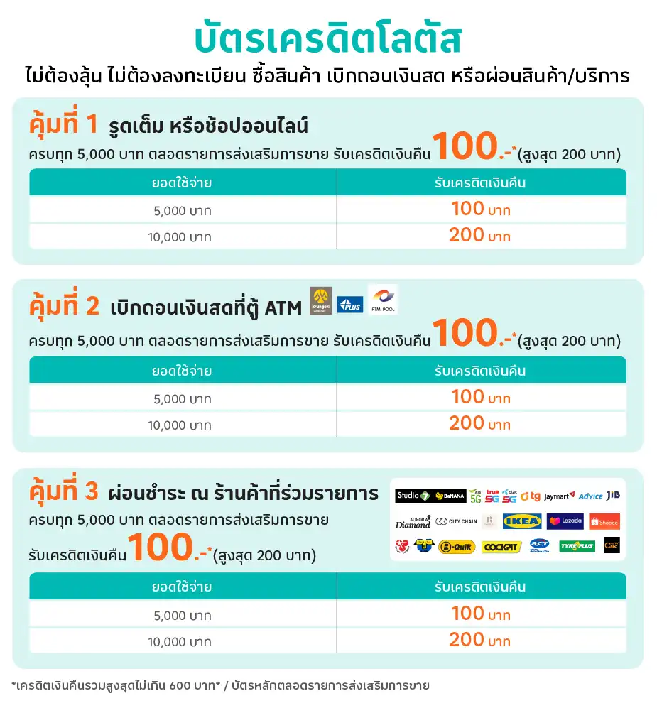• (คุ้มที่ 1) เครดิตเงินคืนจะคำนวณจากรายการใช้จ่าย หรือช้อปออนไลน์ ผ่านบัตรเครดิต โลตัส ยกเว้น กองทุนรวม ดอกเบี้ย และค่าธรรมเนียมต่างๆ ทั้งนี้สามารถรวมรายการใช้จ่ายของบัตรเสริม