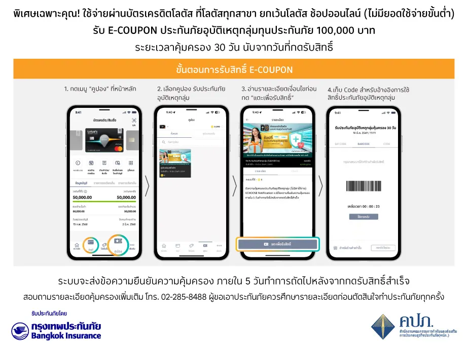 • หากมีข้อโต้แย้งเกี่ยวกับการรับE-couponประกันภัยอุบัติเหตุกลุ่ม หรือไม่ได้รับข้อความยืนยันความคุ้มครอง สมาชิกบัตรต้องติดต่อมายังบริษัทฯ ภายใน วันที่ 13 มีนาคม 2569 เท่านั้น เพื่อขอให้บริษัทฯ ตรวจสอบความถูกต้องหากเกินระยะเวลาดังกล่าวบริษัทฯจะถือว่าการมอบE-couponประกันภัยอุบัติเหตุกลุ่มถูกต้องทั้งหมดและสมาชิกบัตรได้รับข้อความยืนยันความคุ้มครองเป็นที่เรียบร้อยแล้ว