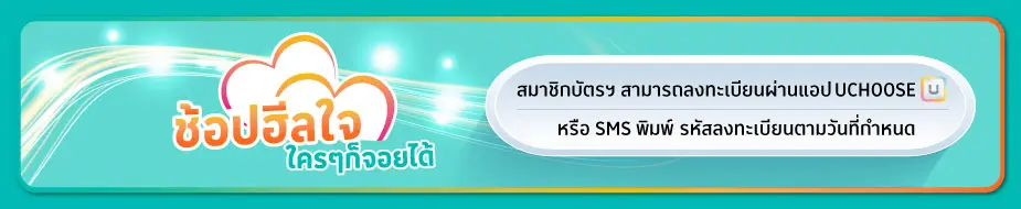 | ช่วงเวลาที่จะได้รับการแจ้งเงื่อนไขรายการ “ช้อปฮีลใจ” | ระยะเวลารายการช้อปฮีลใจ | Code ลงทะเบียน (ลงทะเบียนใหม่ทุกวันอาทิตย์ที่กำหนด) |