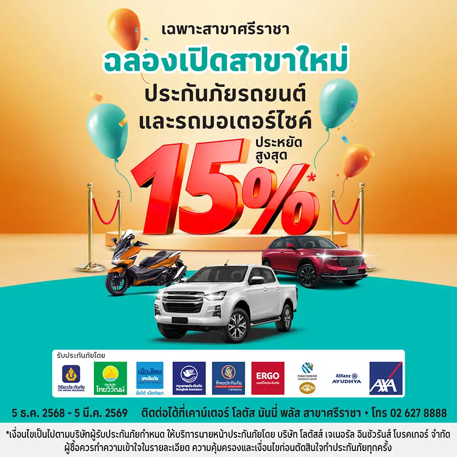 โปรโมชันฉลองเปิดสาขาใหม่ โลตัส ศรีราชา ประหยัดสูงสุด 15% ค่าเบี้ยประกันภัยภาคสมัครใจรถยนต์ และรถมอเตอร์ไซค์
