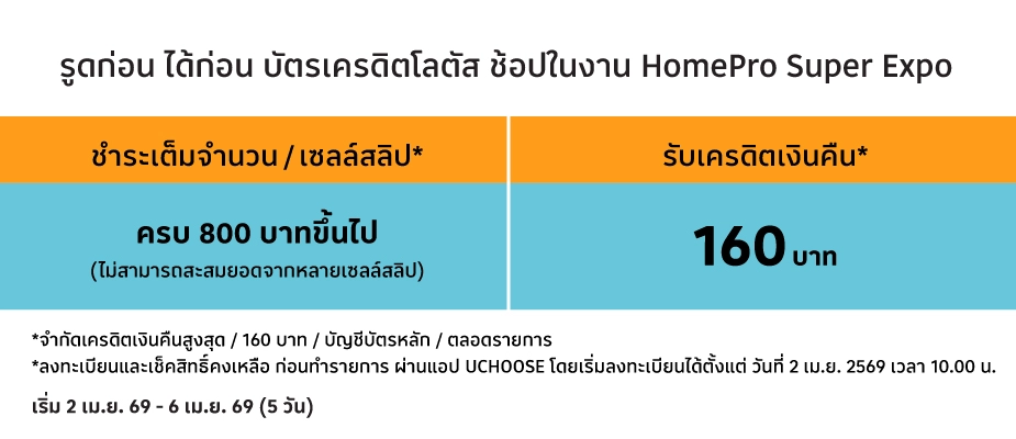• สิทธิพิเศษเฉพาะ 1,000 สิทธิ์ ที่ลงทะเบียนผ่าน UCHOOSE ก่อนทำรายการ และมียอดใช้จ่ายเต็มจำนวนครบ 800 บาทขึ้นไป/เซลล์สลิป ที่ HomePro และ Mega Home ทุกสาขา รวมถึงช่องทางออนไลน์ ในงาน Super Expo ระหว่างวันที่ 2 เม.ย. 69 - 6 เม.ย. 69 (5 วันเท่านั้น) สำหรับรายการที่ร้านค้าได้เรียกเก็บเงินกับทางบริษัทฯ แล้ว (Settlement) เท่านั้น