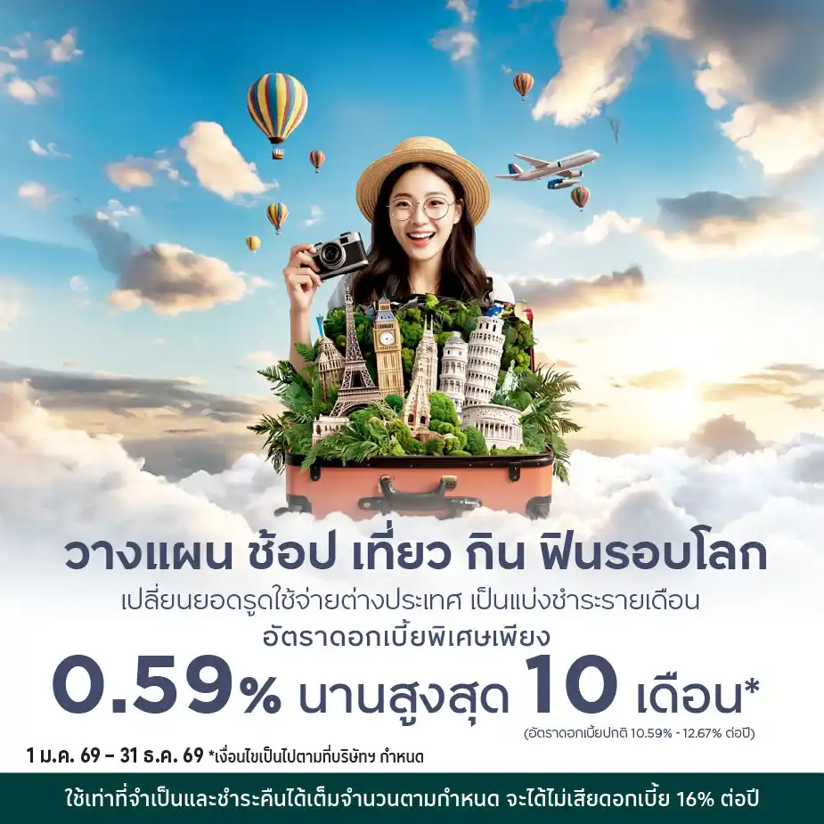 วางแผน ช้อป เที่ยว กิน ฟินรอบโลก ด้วยการเปลี่ยนยอดรูดใช้จ่ายต่างประเทศ เป็นแบ่งชำระรายเดือนอัตราดอกเบี้ยพิเศษเริ่มต้นเพียง 0.59% ต่อเดือน นานสูงสุด 10 เดือน*