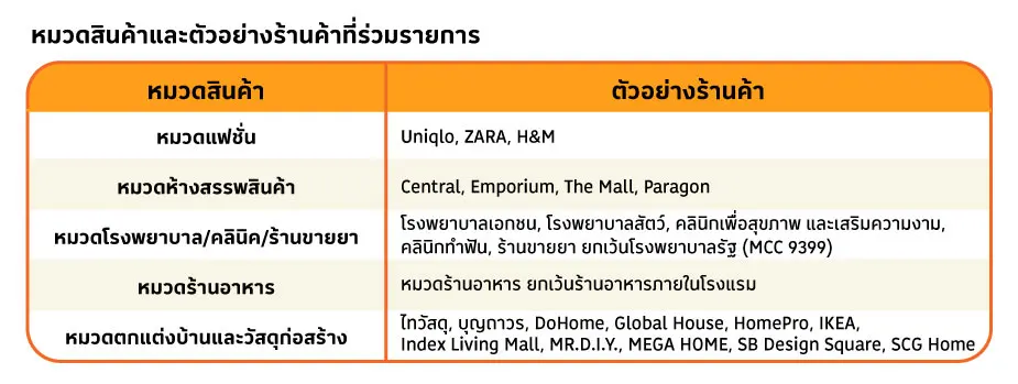 • บริษัทจะใช้ข้อมูลอ้างอิงจาก Merchant Category Code (MCC Code) ตามที่ระบบของบริษัทฯกำหนดเท่านั้น และไม่สามารถขอเปลี่ยนแปลง หรือนำร้านค้าที่อยู่คนละหมวดมานับรวมข้ามหมวด หรือยอดใช้จ่ายที่นอกเหนือจาก MCC Code ที่กำหนดจะถือว่าไม่เข้าหลักเกณฑ์และไม่ได้รับสิทธิประโยชน์ตามโปรแกรม