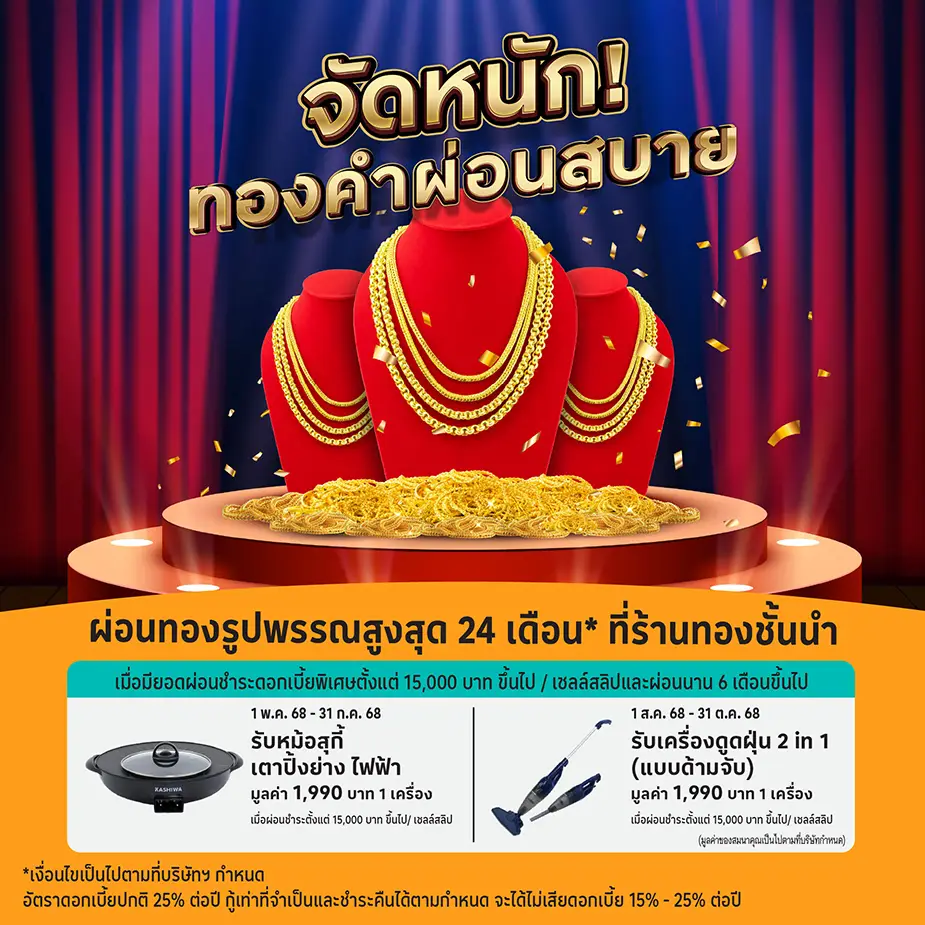 • ระยะเวลาทำรายการผ่อน ตั้งแต่ 1 พ.ย. 68 – 31 ม.ค. 69 **เมื่อมียอดผ่อนชำระตั้งแต่ 50,000 ขึ้นไป / เซลล์สลิปและผ่อนนาน 6 เดือนขึ้นไป รับทองแผ่น 96.5% นน.0.1กรัม ในรูปแบบการ์ด (คละลาย) มูลค่า 599 บาท**